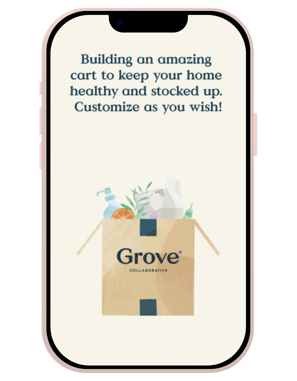 The next step of the onboarding flow is the box filling animation. This is intentional friction that serves as a delight moment, taking a moment to explain that Grove is literally filling your cart for you (visually and in words). I built this animation in After Effects using existing brand assets for the products and ”ingredients” in the cart. My favorite part is the little green tube that flips in at the end.